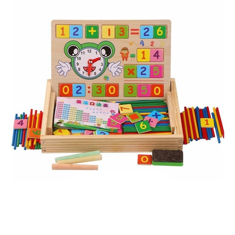 Ela conta com palitos, números, símbolos para operações matemáticas e mais um relógio para seu filho aprender a olhar as horas. A Caixa tem ainda uma lousa para facilitar ainda mais este processo.  ✍️